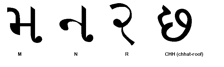 before ending this lessons lets see if you can read your first three sentences in Gujarati using the letters M , N , R and CHH. These have Gujarati words but after this lesson we will start with English words written in Gujarati script. At the end of each sentence is the letter chh ( sounds like the letter ch in rich ) with a short ae vowel mark. The chh sound comes from the chest while saying ch. The chhae word is Gujarati for is .