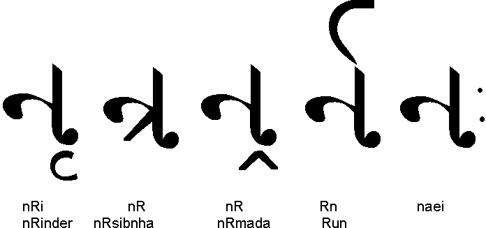 The first is Ri as in wRist , the second and third are just staight Rs as dRama . The next is actually pronounced before the letter , so here it is RUN and the last is another accent mark borrowed from Sanskrit and gives it an aei sound as in prataei -morning.